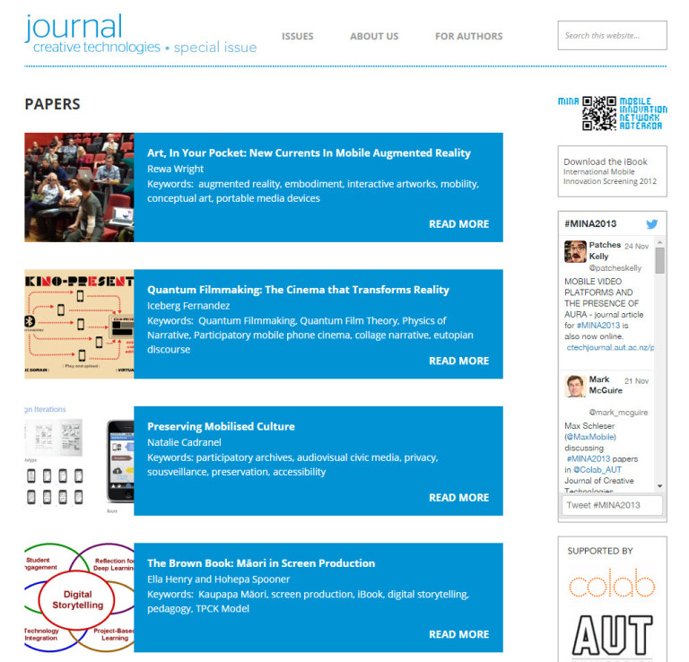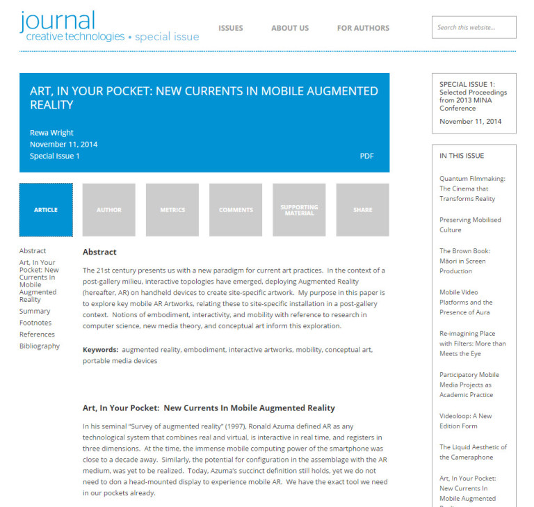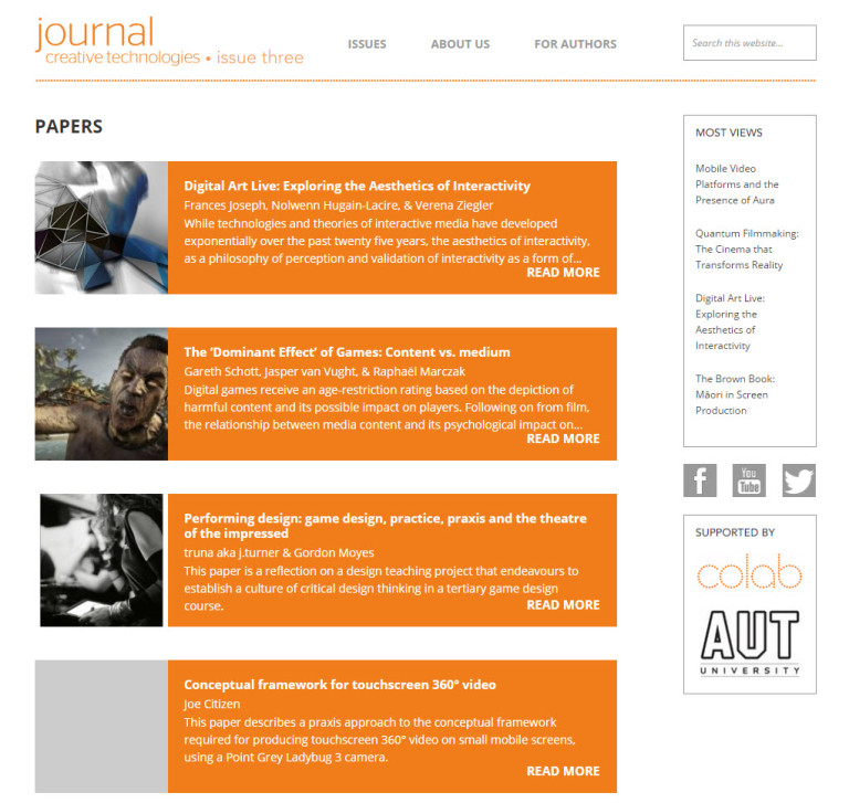 The Journal of Creative Technologies (JCT) is an online, open access, peer-reviewed journal for the publication of research and innovation about new technologies, creative practices, and critical theories. |